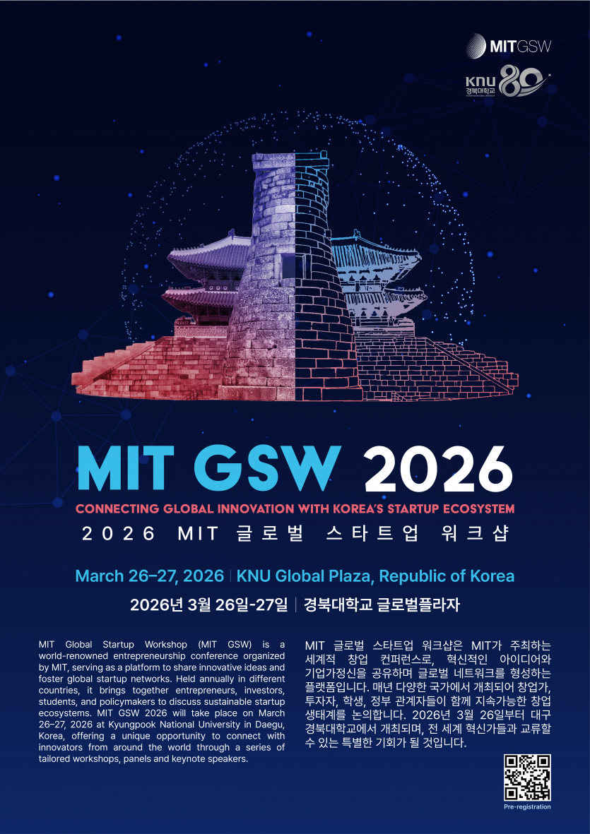 MIT와 경북대학교가 주최하는 MIT GSW 2026은 국내외 연사 및 창업가, 투자자들이 함께하는 글로벌 스타트업 워크숍으로, 창업 생태계 활성화와 글로벌 네트워크 구축을 위한 교류의 장을 마련하고자 합니다. 글로벌 혁신의 장이 될 본 행사에 많은 관심과 참여를 바랍니다.